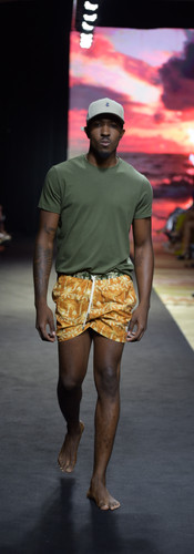 En las pantalonetas de baño con estampados que resaltan el uso de las palmeras en la parte gráfica y la mezcla de colores brillantes como: el naranja, el amarillo, el verde, el café y el terracota.